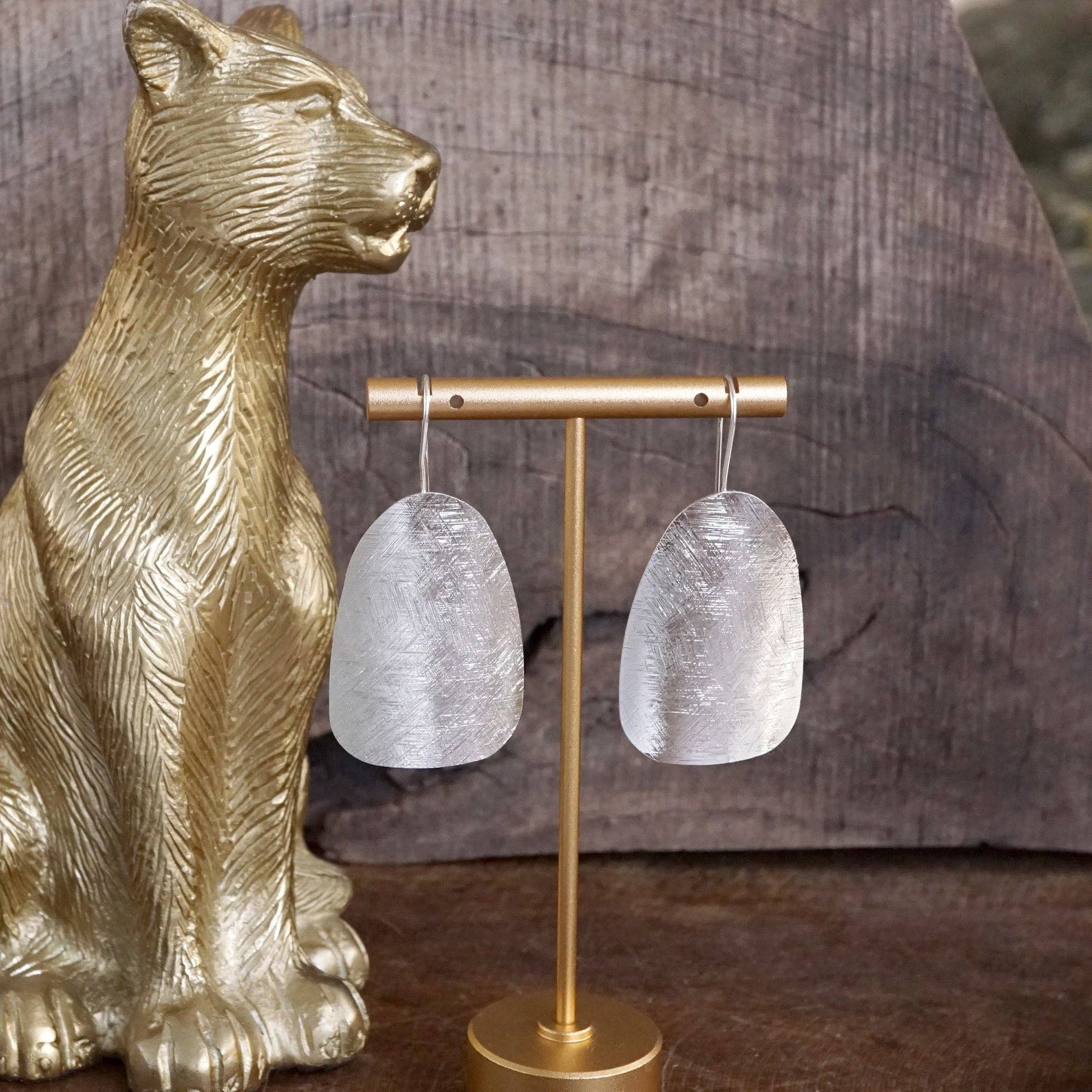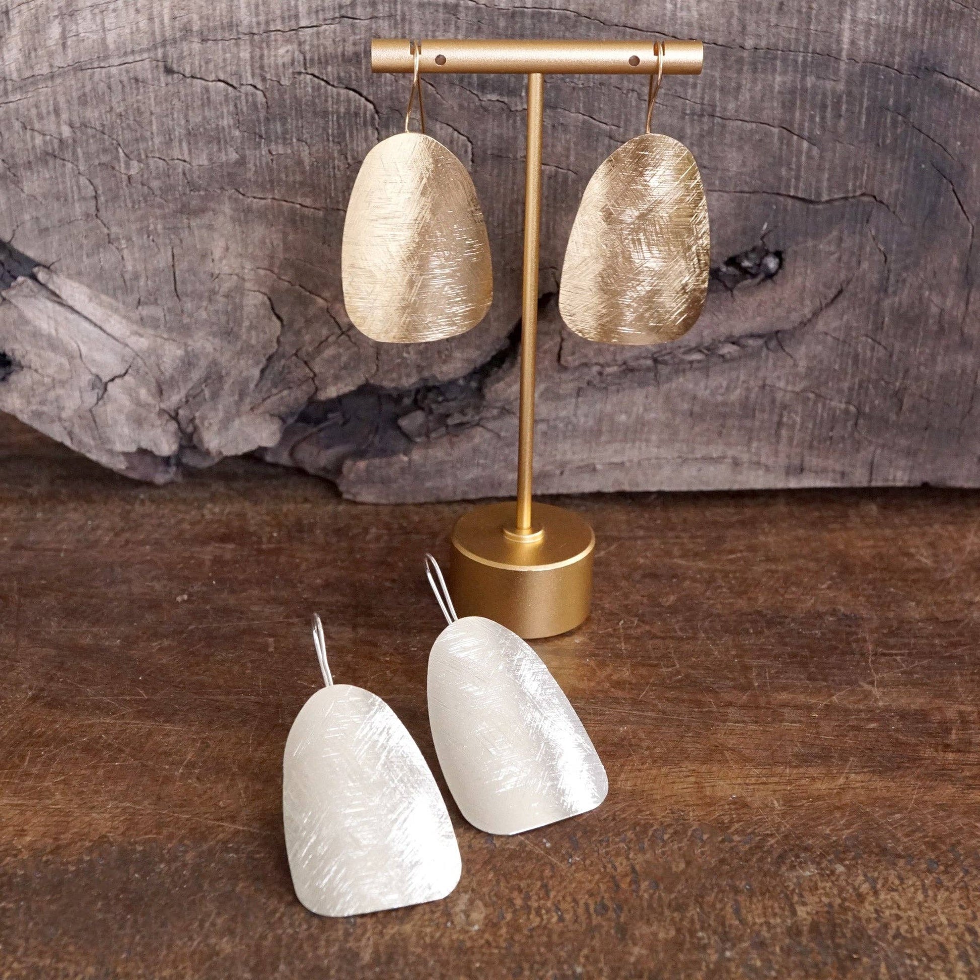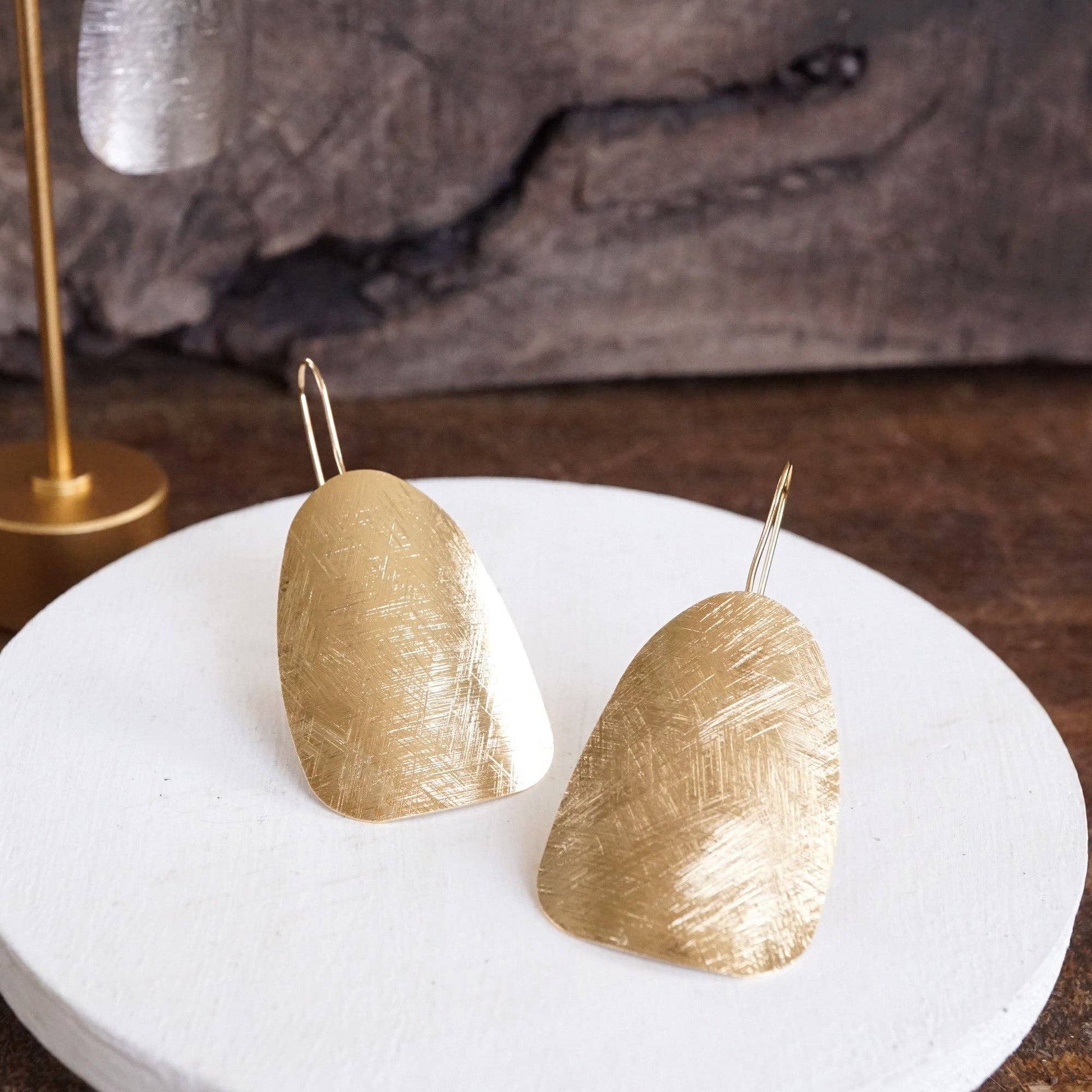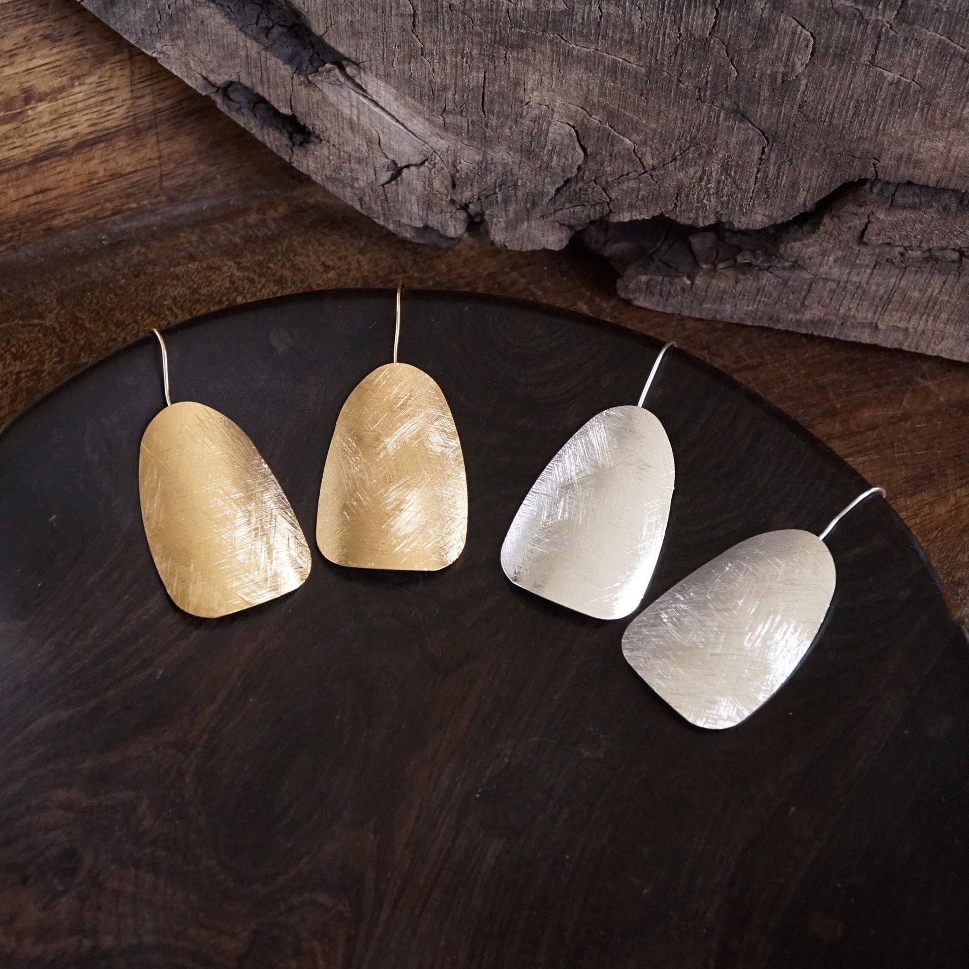 Sculptural yet refined, these curved shield-shaped earrings offer a clean silhouette with quiet strength. The brushed gold or silver tone adds subtle texture, making them ideal for both polished and relaxed looks.