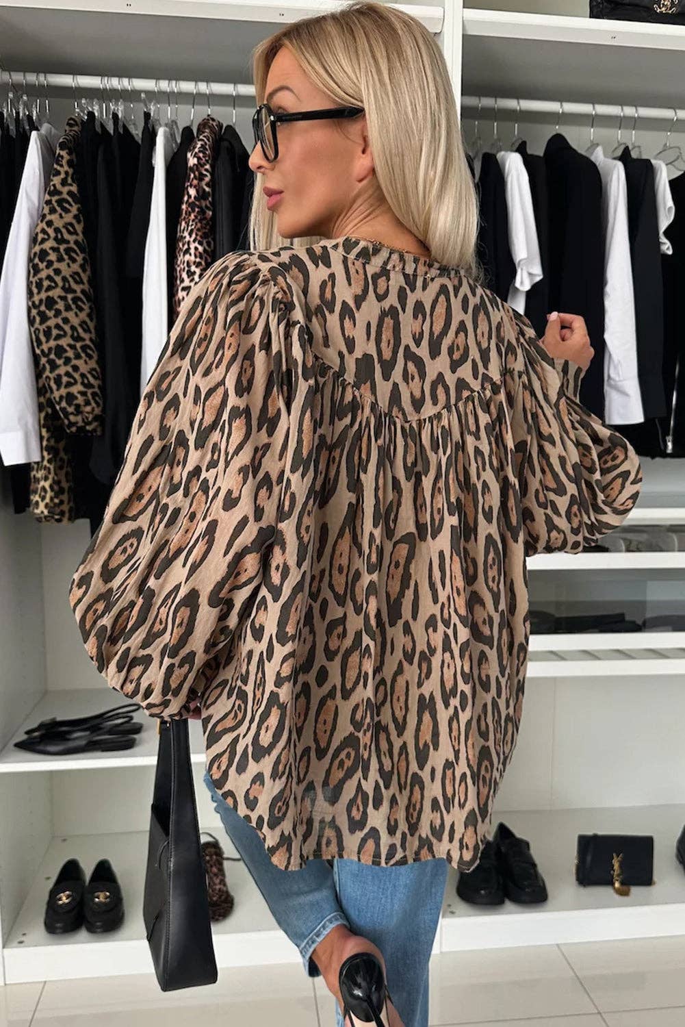Light French Beige Oversized Leopard Print Balloon Sleeve Casual Shirt